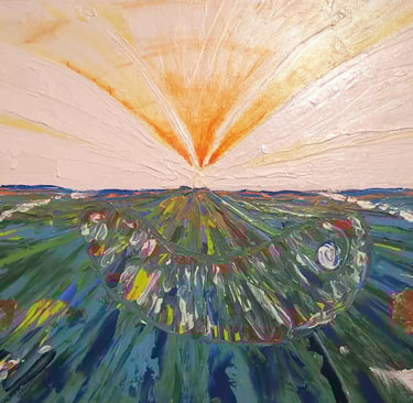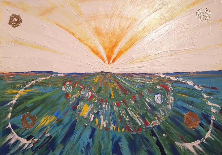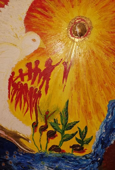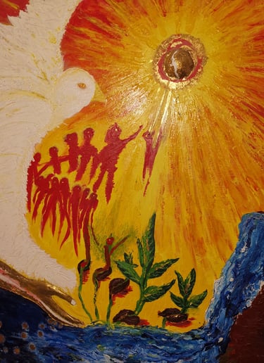 Acrilico con stucco e inserti in foglia d'oro su compensato. La semina delle anime. Nel flusso traboccante della vita , l'anima custodita dalla purezza , germoglia, cresce e dopo intere vite torna all'essenza.