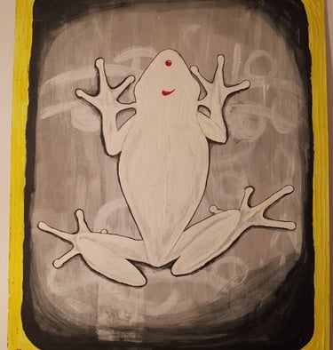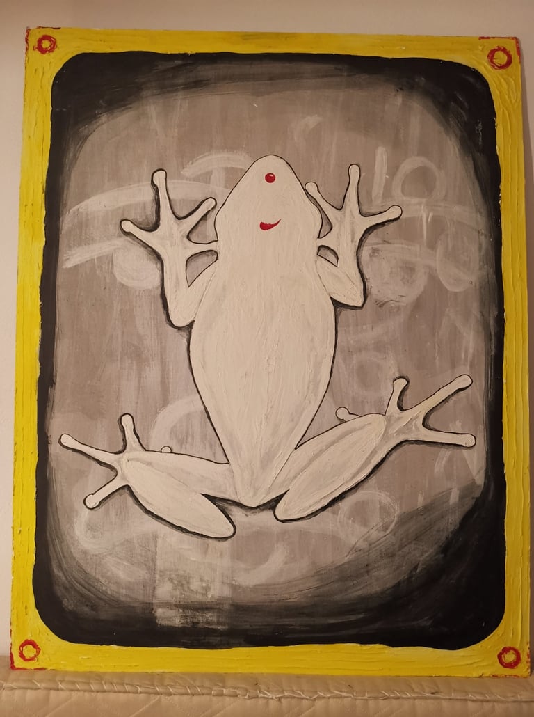 Acrilico e stucco su compensato. Ho fatto un sogno, la rana scesa dallo scivolo, dal punto rosso sul muso si trasformerà in drago. Sullo sfondo io sono pace, confuso, quasi dimenticato.