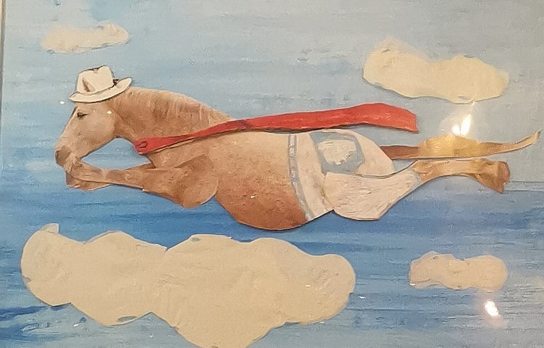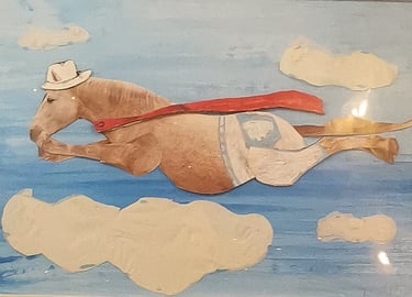 Quanto amore in Super Cavallo! Super Cavallo ci ricorda la semplicità e la leggerezza, leggerezza che aiuta quando le situazioni si fanno pesanti e la stanchezza fa sorgere cupi pensieri. Super cavallo nasce dal riciclo di una pagina di calendario dove la cavallerizza sedeva sulla sua parte posteriore, da qui i pantaloni a coprire sinuose gambe. Successivamente sono nati cappello, mantello e la sua super capacità di volare libero, capacità che ispira.