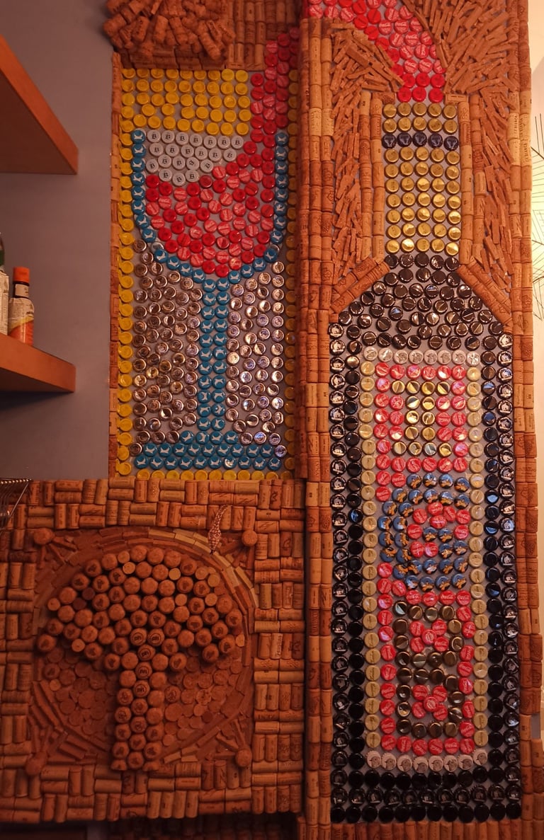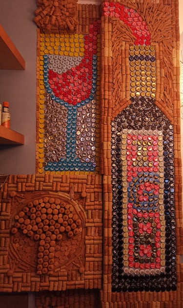 Opera a muro con tappi di sughero, di birra e bibite varie. Rappresenta la bottiglia di vino aperta che fluisce nel calice, l'iscrizione sulla bottiglia IGB è la sigla del locale, Il Giardino Blu, dove lo si può vedere dal vivo. In basso a sinistra vi è rappresentato un'albero a ricordare il giardino.